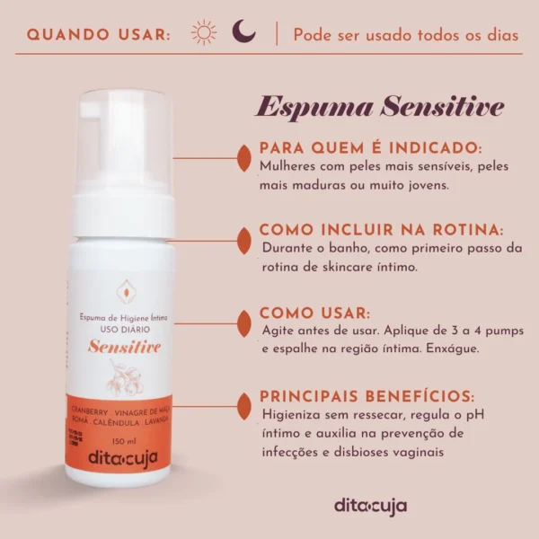 A Espuma de Higiene Íntima Sensitive da Dita Cuja foi criada especialmente para peles sensíveis, maduras ou frequentemente irritadas.